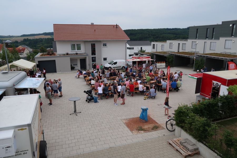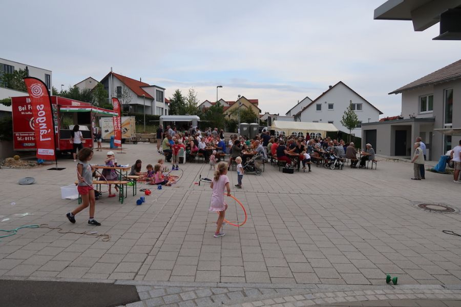 So wurde der Quartiersplatz im Pfaffenhau 5 zum Festplatz umfunktioniert, auf dem sich im Laufe des Nachmittags mehr als 100 Gäste an den Biertischen und Bänken niederließen, um sich bei Speis und Trank zu amüsieren. Da konnte auch ein kurzer Regenschauer die Besucher nicht vertreiben. Auch für musikalische Unterhaltung durch die JUMO Wippingen war gesorgt und für die Kinder stand ein ganzes Ape- Dreirad mit Spielzeug, das wir vom Guten Hirten ausgeliehen hatten, zur Verfügung.
